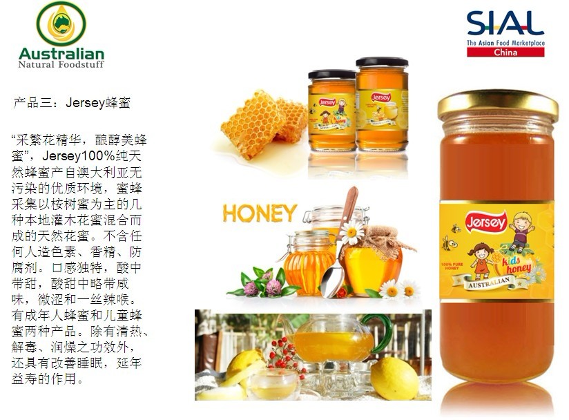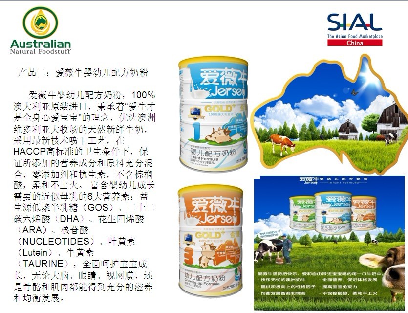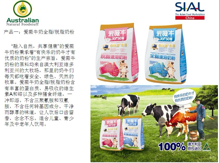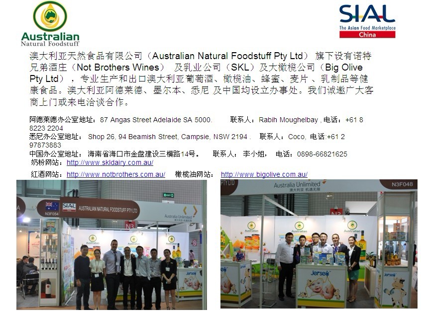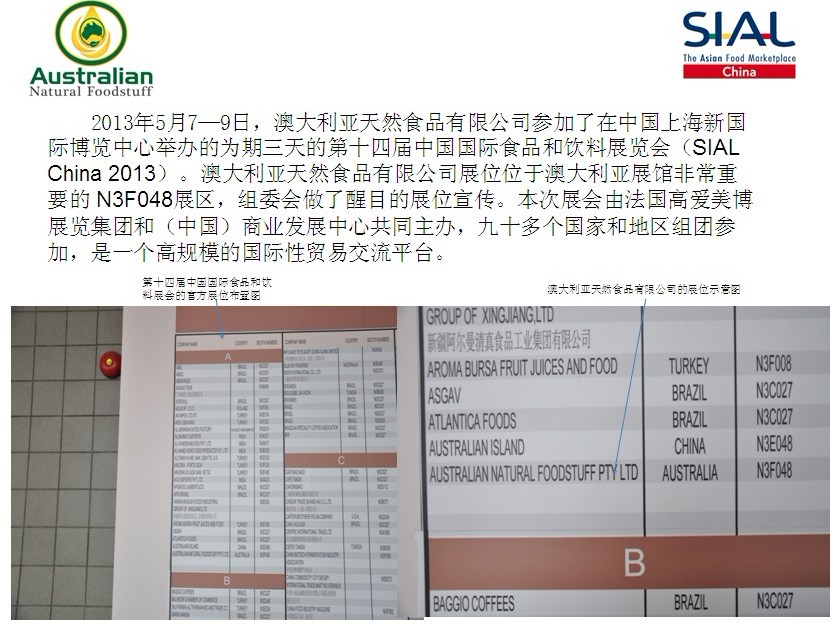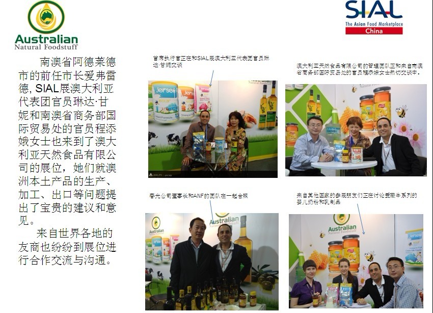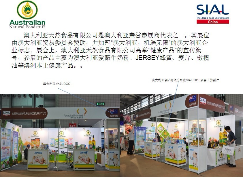 5月7-9日,第十四屆中國國際食品和飲料展覽會(SIAL China 2013)在上海新國際博覽中心舉辦。澳大利亞天然食品有限公司(Australian Natural Foodstuff Pty Ltd)攜其生產(chǎn)的高品質(zhì)的澳大利亞本土奶粉、橄欖油、蜂蜜、麥片等健康食品閃亮登場。本次展會由法國高愛美博展覽集團和(中國)商業(yè)發(fā)展中心共同主辦。九十多個國家和地區(qū)2000多企業(yè)參展,本次展會是一個高規(guī)模的國際性貿(mào)易交流平臺。