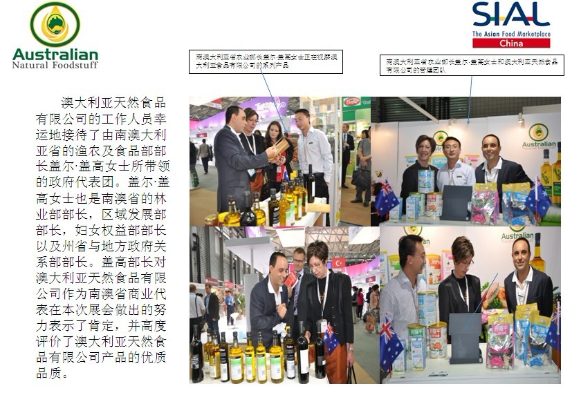 作為一家在澳洲自行生產(chǎn)優(yōu)質(zhì)本土產(chǎn)品及大力開展出口業(yè)務(wù)的澳洲公司,澳大利亞天然食品有限公司備受澳洲政府的高度重視及大力支持。南澳大利亞省的漁農(nóng)及食品部部長蓋爾·蓋高女士所帶領(lǐng)的政府代表團親臨展位助威宣傳。蓋爾·蓋高女士也是南澳省的林業(yè)部部長,區(qū)域發(fā)展部部長,婦女權(quán)益部部長以及州省與地方政府關(guān)系部部長。蓋高部長對澳大利亞天然食品有限公司作為南澳省商業(yè)代表在本次展會做出的努力表示了肯定,并高度評價了澳大利亞天然食品有限公司產(chǎn)品的優(yōu)質(zhì)品質(zhì)。南澳省阿德萊德市的前任市長愛弗雷德, SIAL展澳大利亞代表團官員琳達·甘妮和南澳省商務(wù)部國際貿(mào)易處的官員程添娥女士也來到了澳大利亞天然食品有限公司的展位,她們就澳洲本土產(chǎn)品的生產(chǎn)、加工、出口等問題提出了寶貴的建議和意見。文昌市春光食品有限公司是澳大利亞天然食品有限公司中國總代理,本次展會的成功舉辦得到了該公司的大力支持。