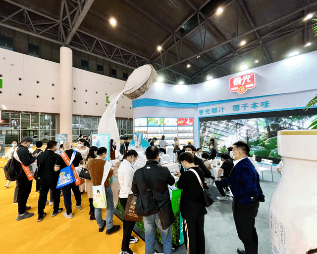 春光直接在展位上豎起了高大的椰子模型,加上傾瀉而出的奶白椰汁,極具海南風(fēng)韻,數(shù)米外都能感覺(jué)到椰香撲鼻。