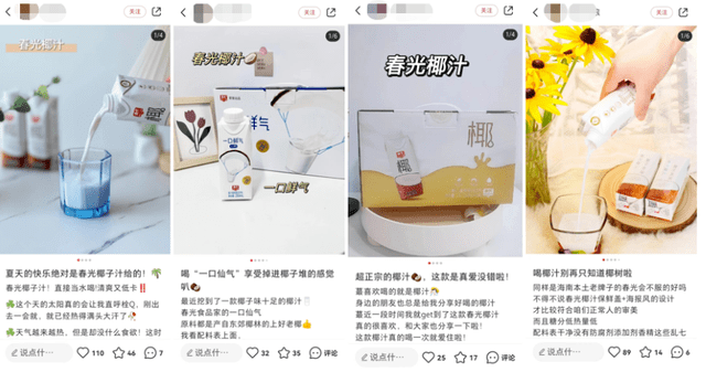 在線上的推廣中,春光多次登上頭部主播直播間,獲得廣東夫婦、東方甄選、王芳、曹穎、劉濤等眾多明星及主播信任站臺(tái),在直播評(píng)論區(qū)中,“好喝”“椰味濃郁”“口感新鮮”“無(wú)限回購(gòu)”等成為粉絲評(píng)價(jià)的高頻詞。