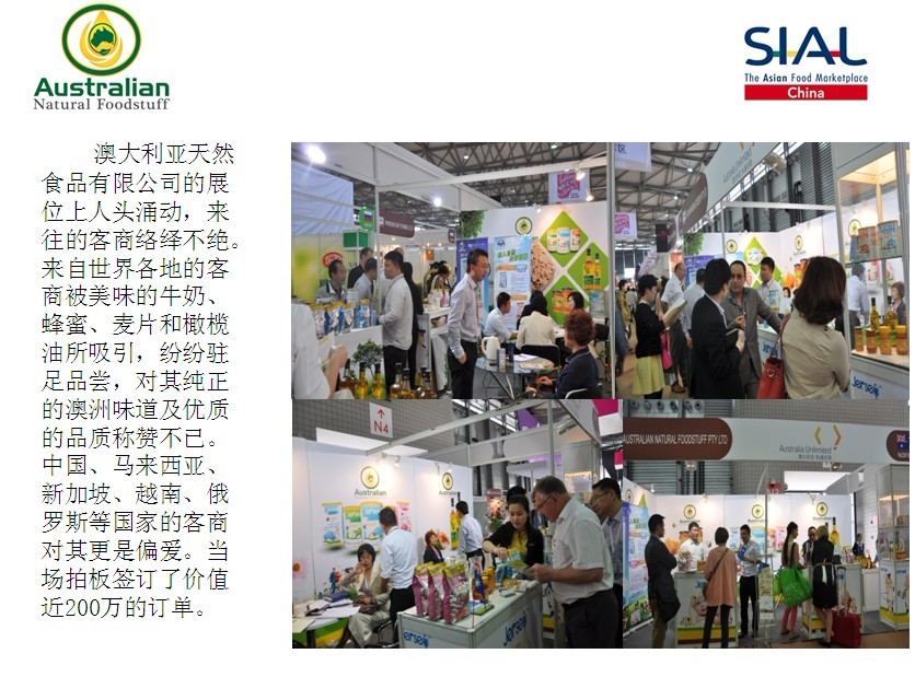 5月7-9日,第十四屆中國國際食品和飲料展覽會(SIAL China 2013)在上海新國際博覽中心舉辦。澳大利亞天然食品有限公司(Australian Natural Foodstuff Pty Ltd)攜其生產(chǎn)的高品質(zhì)的澳大利亞本土奶粉、橄欖油、蜂蜜、麥片等健康食品閃亮登場。本次展會由法國高愛美博展覽集團和(中國)商業(yè)發(fā)展中心共同主辦。九十多個國家和地區(qū)2000多企業(yè)參展,本次展會是一個高規(guī)模的國際性貿(mào)易交流平臺。